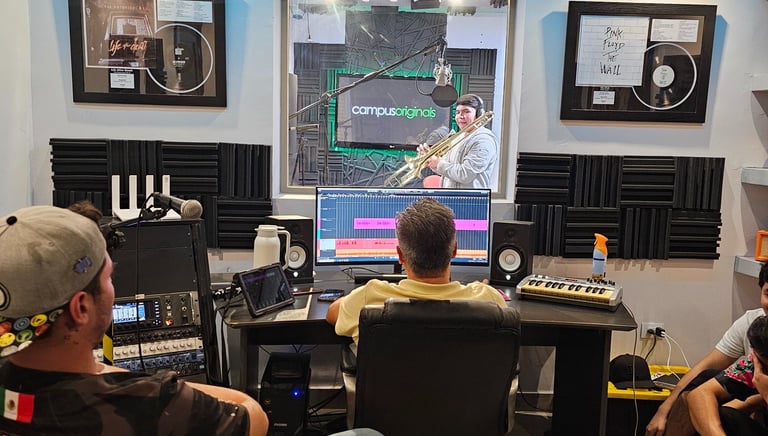 Captura, Mezcla y Masteriza tu Sonido con Maestría. Este es el santuario del audio en Campus Juárez. Un espacio meticulosamente tratado acústicamente, equipado para la captura prístina, la mezcla detallada y la masterización profesional de sonido para contenidos, grupos musicales, talentos vocales y diseño de audio en general. Aquí, cada nota y cada palabra alcanzan su máximo potencial sonoro.